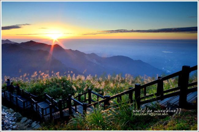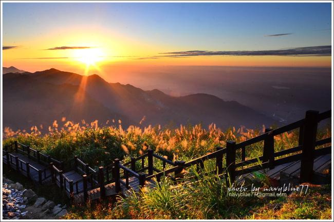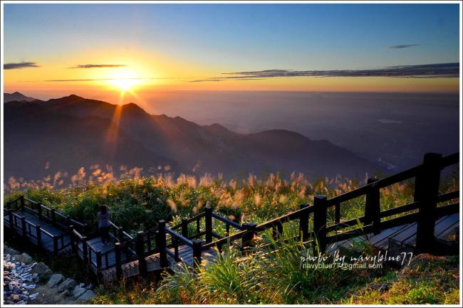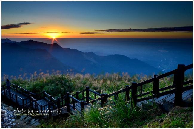 隙頂的步道布魯常走,卻一直沒機緣拍到令人感動的夕照雲海,這回抽空上山,先到隙頂之星步道散步一番,然後驅車直上二延平山頂觀雲平台。布魯下午4點就到達,但觀雲平台上已架滿了腳架,勉強屈身在一個欄杆前的小突出空地,等待5點左右與夕陽的約會。這天的西天出奇的乾淨,雲海沒有了,但當太陽落下到天際線時,奮力的耀出黃橙橙的金光,在場的每一個人的眼睛也都跟著閃亮了起來。