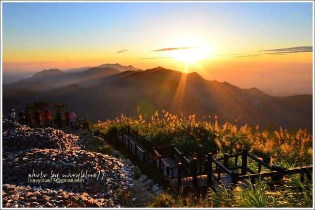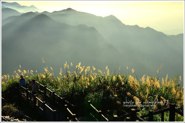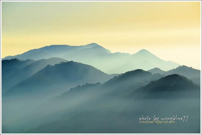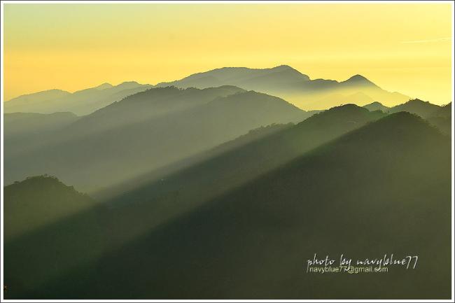 ●這天原來的雲層到後來竟然出乎預料的完完全全消散了,著名的二延平雲海雲瀑也宣告摃龜了。雲實在是很難捉摸的東西,還好夕陽在層巒之間灑出層次的光,稍稍彌補了沒有雲海的缺憾。
