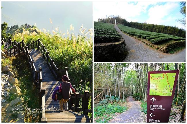 ●左圖:二延平山步道接近山頂平台段,這是五星級的觀景步道。右上圖:二延平山頂附近有十分漂亮的茶園。右下圖:阿管處現在在二延平山新闢了茶霧之道,由二延平步道上山,可以循茶霧之道下山,走成小O形。